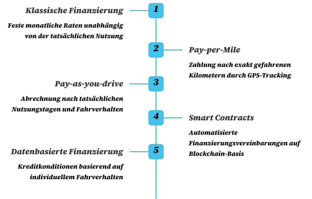 Noch zukunftsweisender werden Mobilitätskonzepte im Kontext von Smart Contracts auf Blockchain-Basis. Diese ermöglichen automatisierte Finanzierungsvereinbarungen, bei denen z. B. eine Leasingrate nur dann fällig wird, wenn das Fahrzeug tatsächlich genutzt wurde. Im Zusammenhang mit E-Mobilität werden Modelle denkbar, bei denen sich das Fahrzeug sogar selbst abschaltet, wenn Zahlungen ausbleiben. Erste Pilotprojekte hierzu laufen bereits in Asien und Nordamerika.