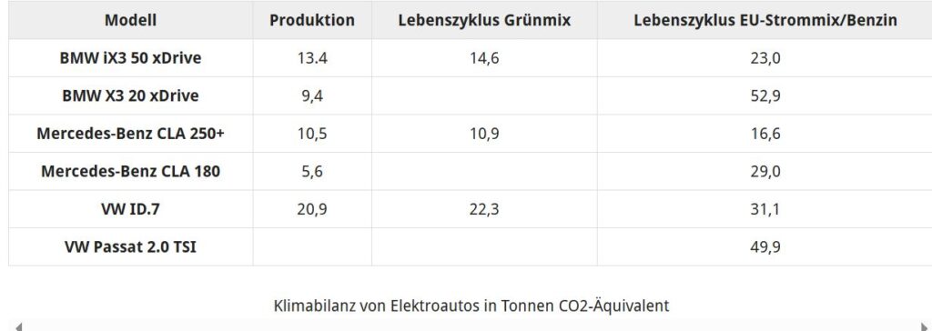 Dabei fällt auf: VW nimmt selbst bei reinem Grünstrom in der Nutzungsphase einen CO2-Ausstoß von 1,4 Tonnen an, während Mercedes lediglich 0,1 Tonne angibt. VW schreibt dazu: „Auch bei der Errichtung und dem Betrieb von Anlagen für erneuerbare Energien entstehen unter anderem CO₂-Emissionen. Außerdem führt die Produktion typischer Verschleißteile unter anderem zu CO₂-Emissionen, die in der Darstellung berücksichtigt werden.“